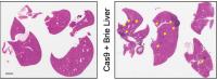Mouse liver without liver metastases (left), and mouse liver with multiple liver metastases (right, with yellow arrows) developing as a result of genetic kinase deletions.