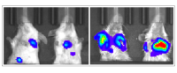In vivo luminescence imaging of lung tumors (metastasized from breast cancer) in mouse models, comparing the keto diet (right image) and the control (left image).